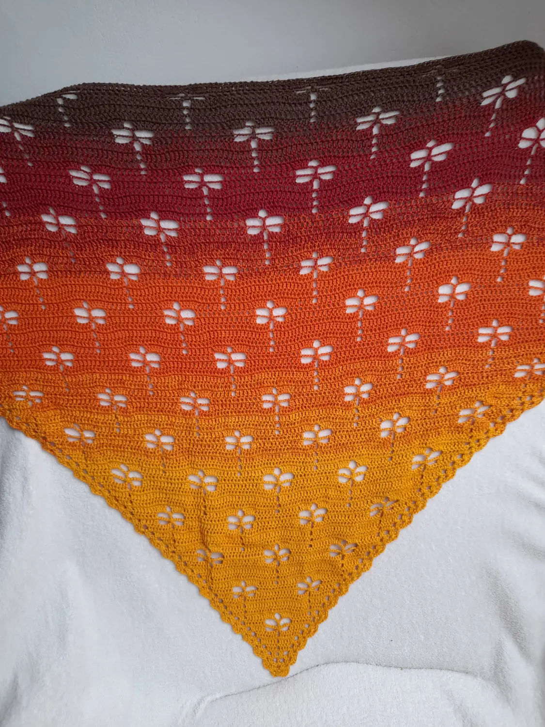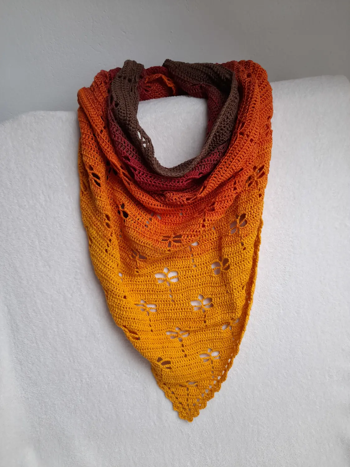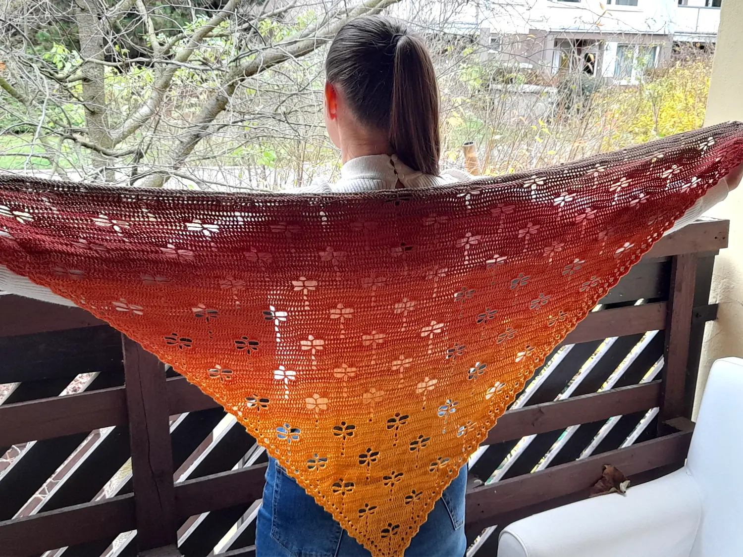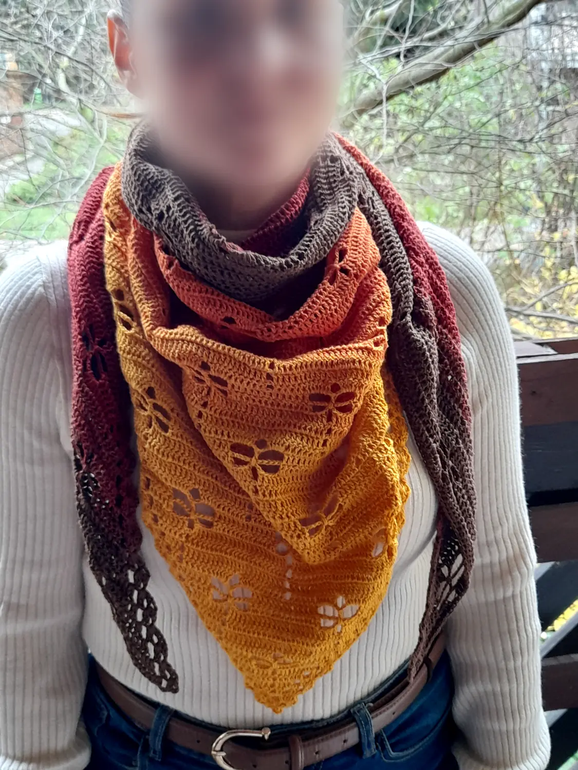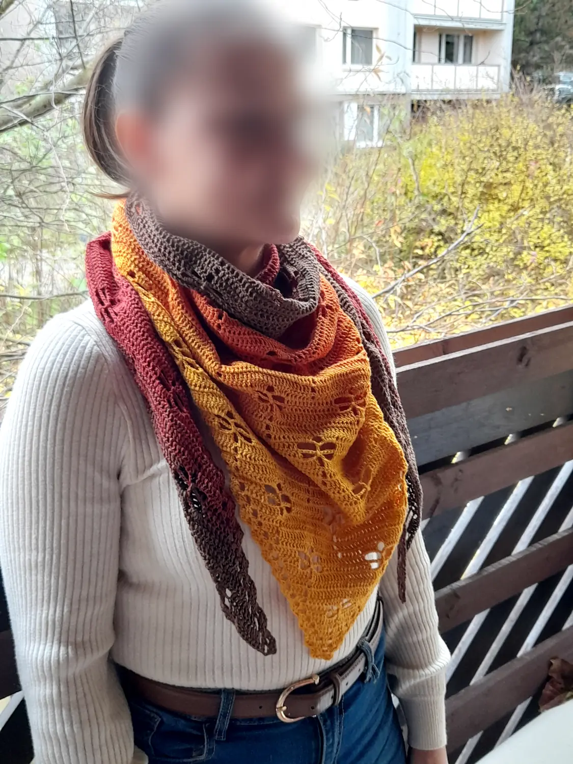 Šátek Vážky je klasický šátek do cípu, kter jsem vyráběla z nádherného klubíčka od YarnMellow Butterfly a klubíčko má název V listí. Jde o kombinaci krásných podzimních tónů, ale věřím, že šátek najde uplatnění i v jiných ročních obdobích.